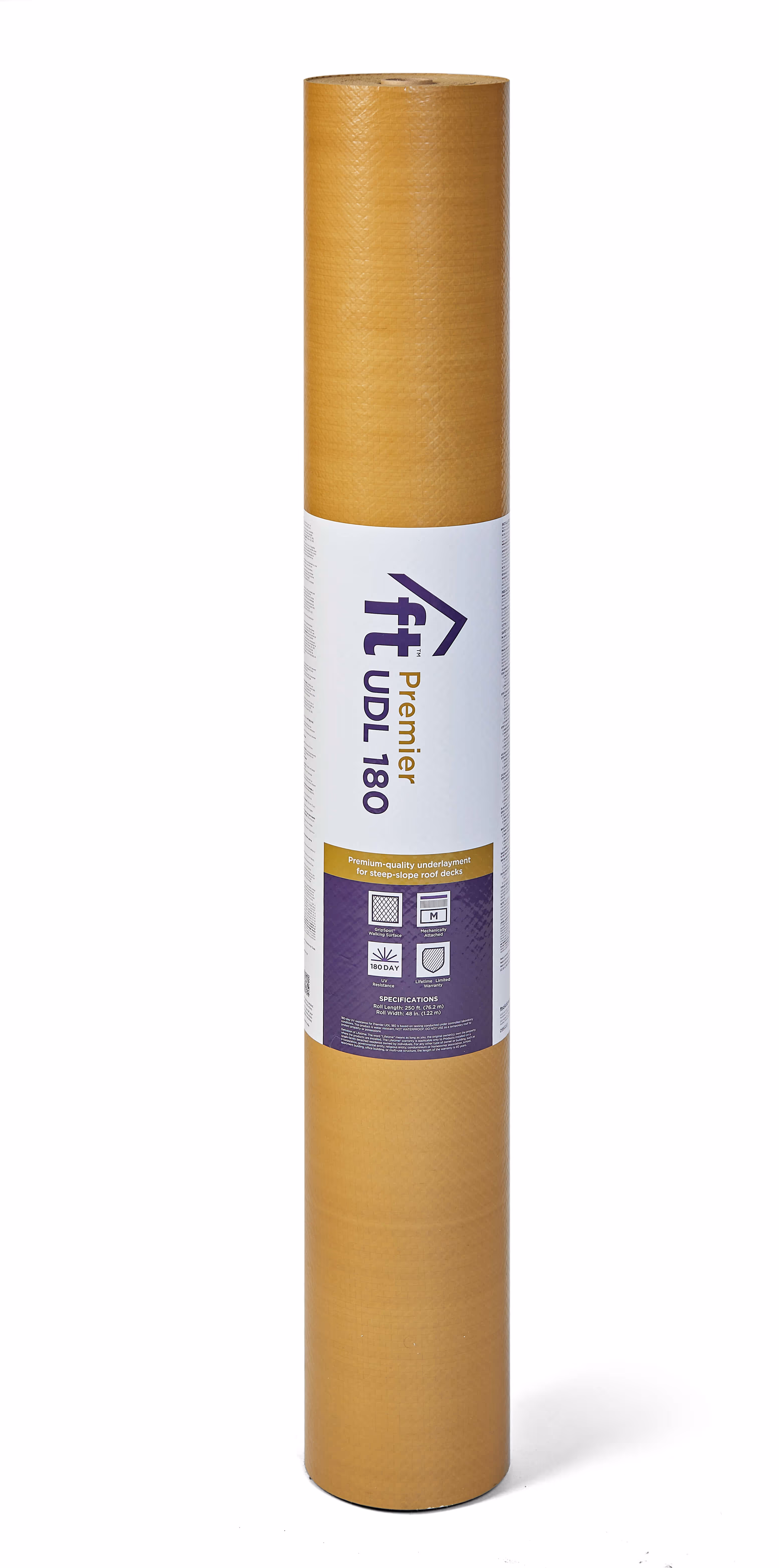 FT Solutions Premier UDL 180 (Formerly FT Synthetics Platinum) premium-quality steep-slope synthetic roofing underlayment is durable and helps protect your roof deck from moisture. It's ideal for use under most primary steep-slope roofing materials, such as metal, cement tiles, clay tiles, slate, and wood, asphalt and synthetic shingles.